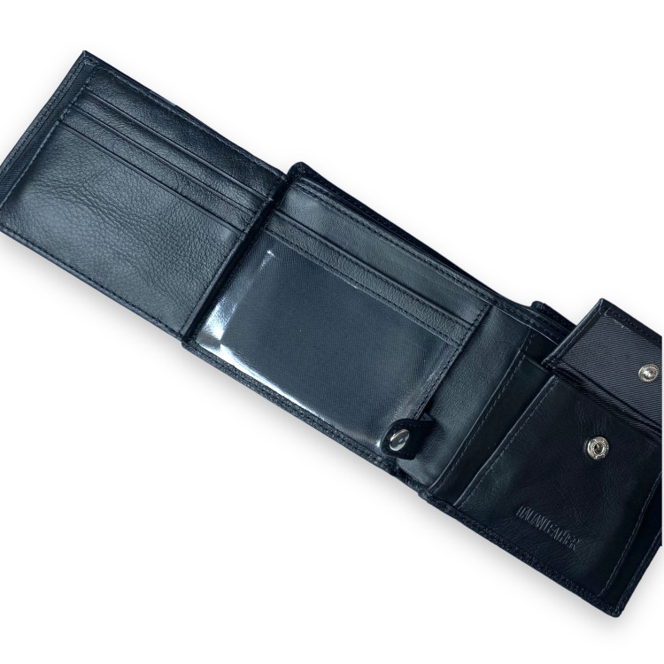 Удобный и качественный мужской кошелек из натуральной кожи. Фиксируется кнопкой. Внутренний разворот открывает доступ к основным отделениям. Предусмотрены два отделения для купюр одно на молнии и шесть ячеек для пластиковых карт. Есть четыре прозрачных отделения и внешнее открытое отделение. Отдел монет находится внутри и закрывается на кнопку.