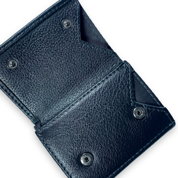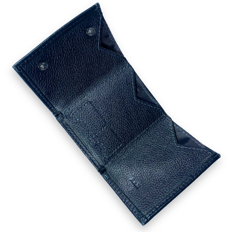 Качественный мужской из натуральной кожи имеет одно отделение для купюр и пять ячеек для пластиковых карточек. На внутреннем развороте находятся две ячейки для карт памяти. Предусмотрены два прозрачных отделения и наружное отделение на молнии. Фиксируется посредством двух кнопок.