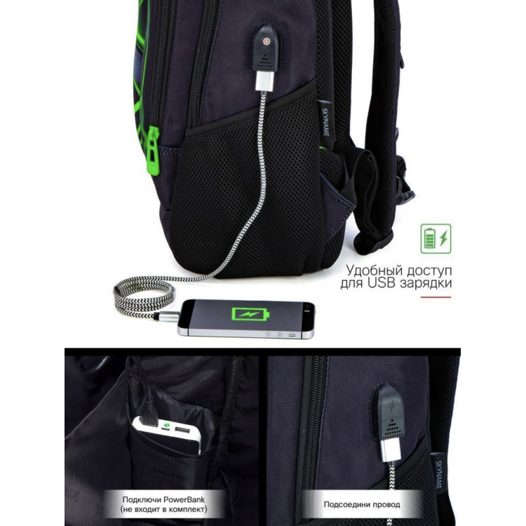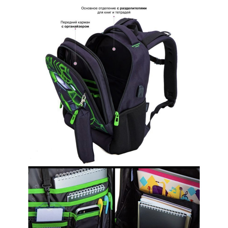 Особенности: ортопедическая спинка, водоотталкивающий материал, слот-переходник для USB, органайзер, стойкие пластиковые ножки, пенал в комплекте