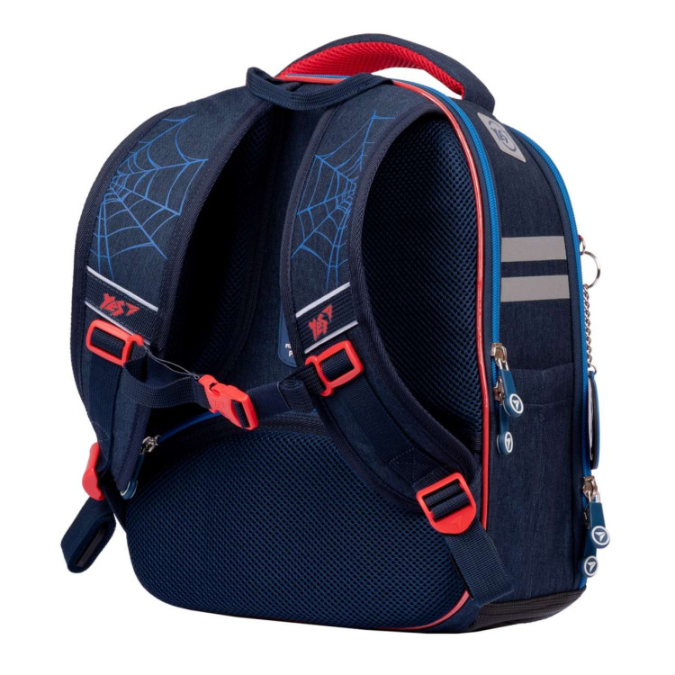 Школьный рюкзак YES, каркасный, два основных отделения, два открытых боковых кармана, скрытый карман на спинке, отделение для школьных принадлежностей, органайзер, светоотражающие элементы, нагрудный ремень с регулировкой по высоте, брелок-подвес, размер: 35*28*15 см, серо-синий Marvel Spiderman.