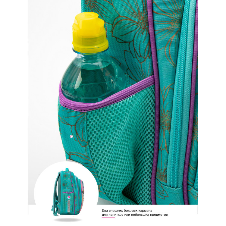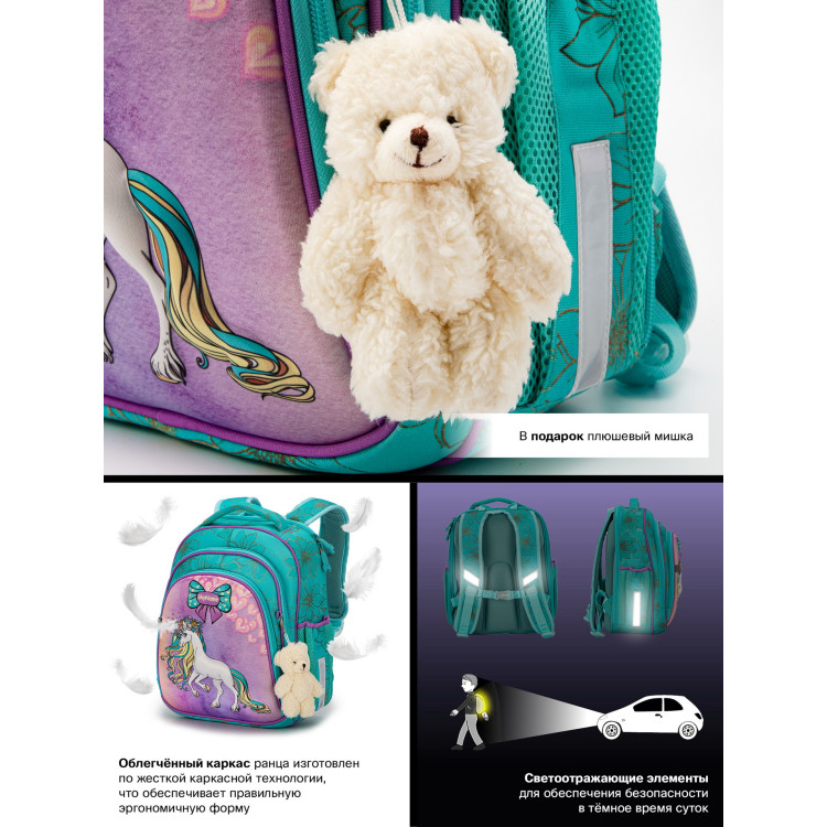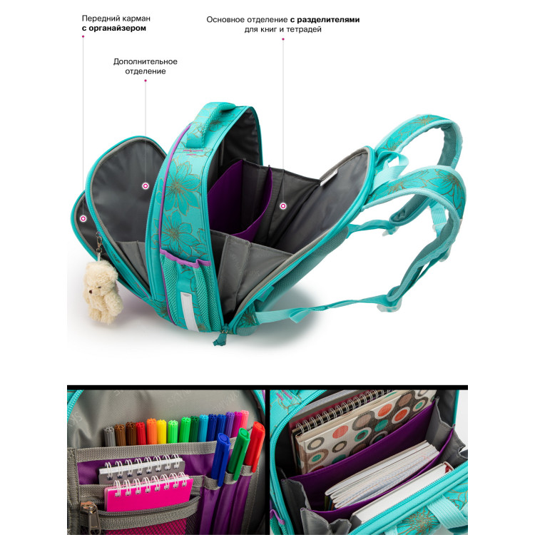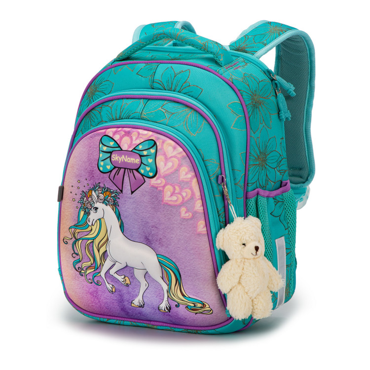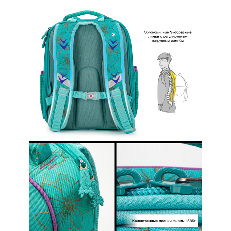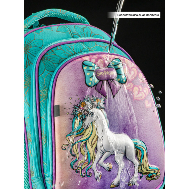 Ранец для девочки младших классов 5022 жесткий каркас, два отделения, фронтальный карман с рисунком, боковые карманы на липучках,SkyName размер:30*16*36 см, бирюзовый