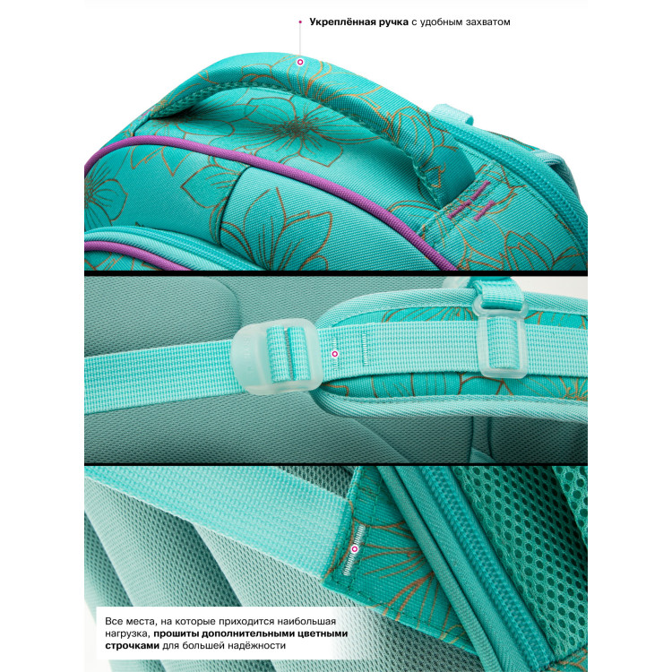 Облегченный каркас ранца изготовлен по жесткой каркасной технологии, обеспечивающей правильную эргономичную форму. Каркас не деформируется при погрузке и распределяет вес по всей площади ранца.