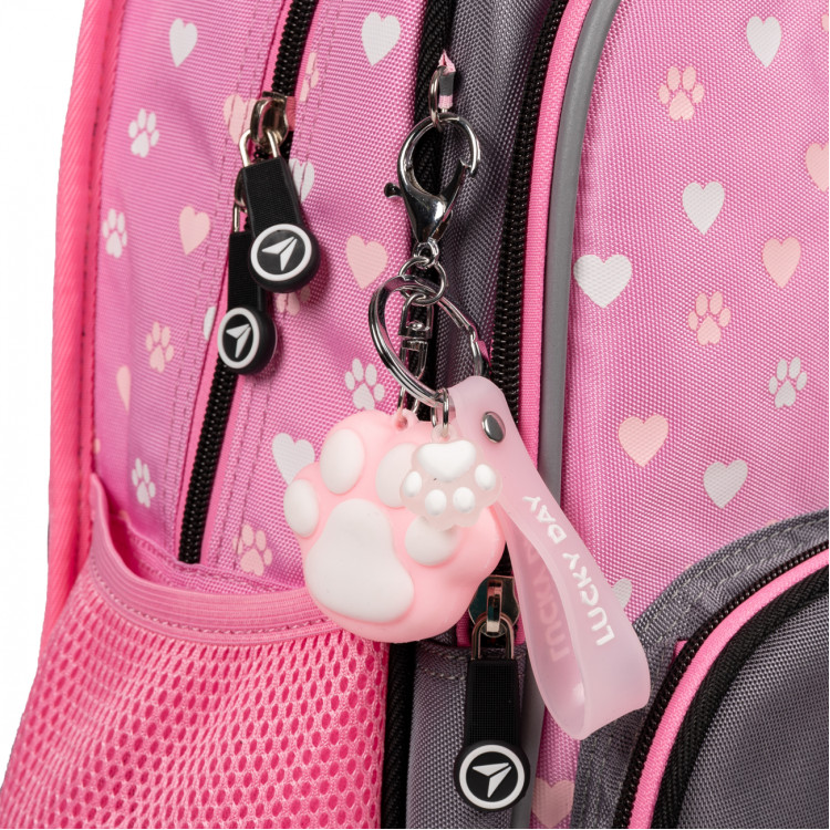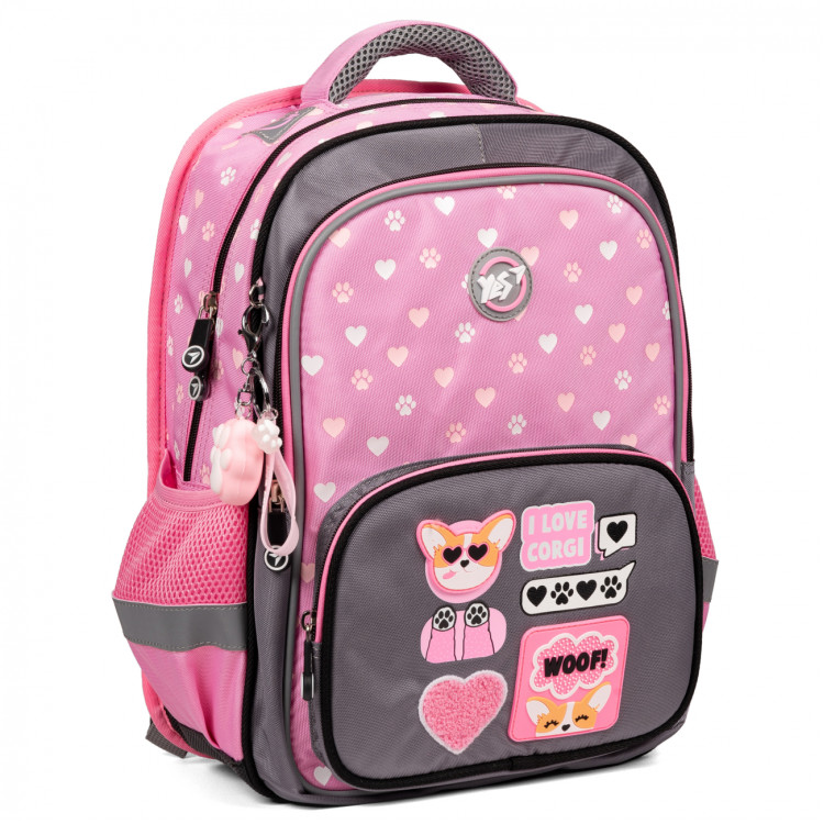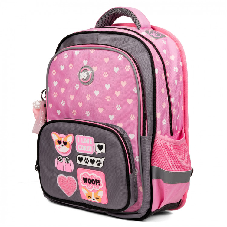 Розовый цвет в сочетании с серым создает волшебный образ, который обязательно понравится вашей маленькой моднице. А комплектация рюкзака миленьким брелоком в форме кавычки изображенного на нем щенка-корги делает этот рюкзак еще более привлекательным для детей.