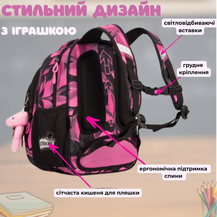 Рюкзак изготовлен из износостойкого полиэстера, который отлично выдерживает ежедневное использование. Анатомическая спинка обеспечивает правильное положение спины, а уплотненное дно сохраняет форму рюкзака. Светоотражающие элементы повышают безопасность ребенка в темное время суток. В комплекте – милый брелок-медвежонок, который добавляет изделию еще больше очарования.