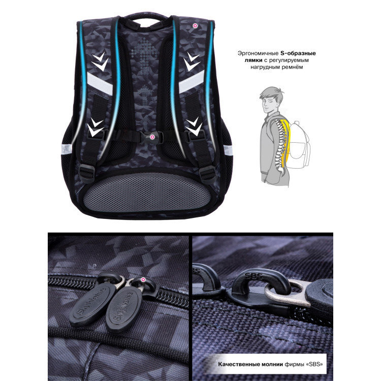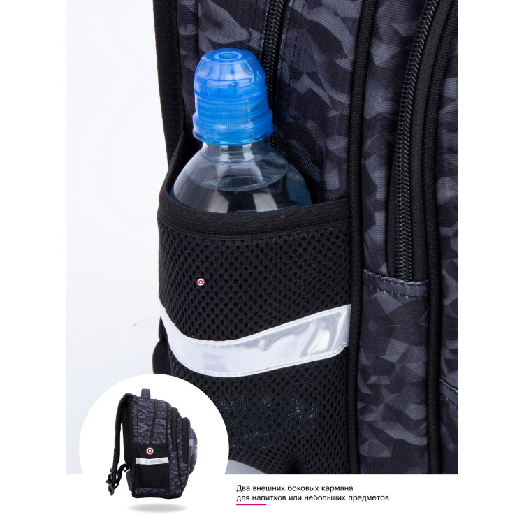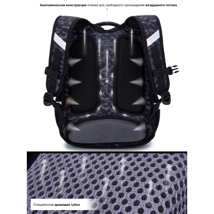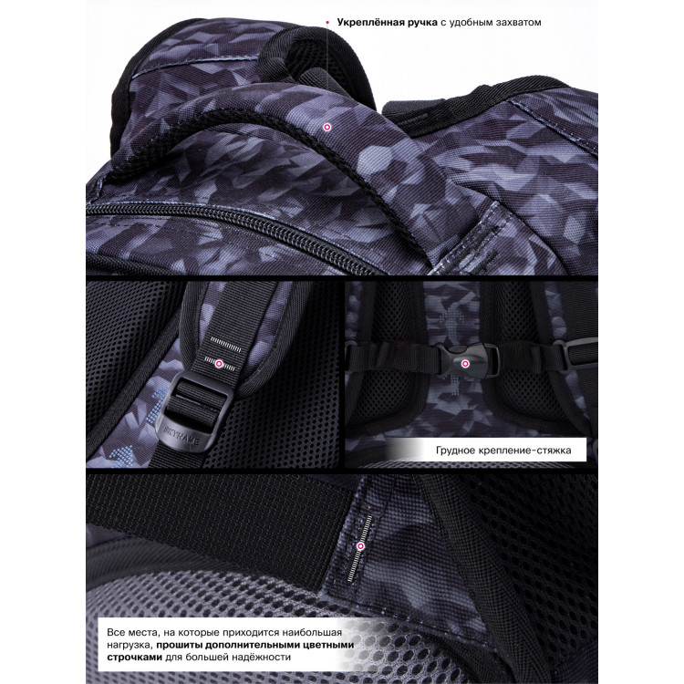 Светоотражающие элементы расположены на передней, задней и боковой частях рюкзака, для обеспечения безопасности в темное время суток.