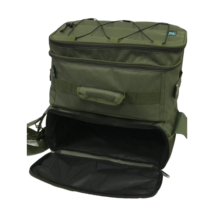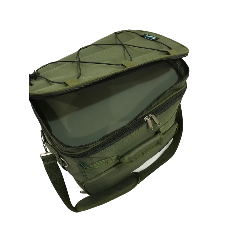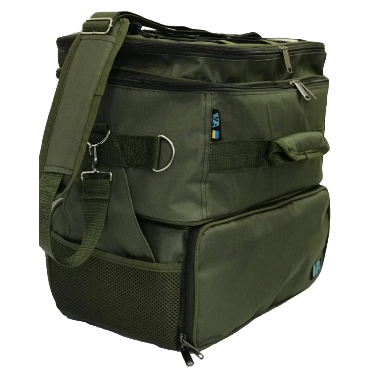 Сумка имеет размеры 40*40*25 см и объем 40 литров, что позволяет удобно разместить все необходимые рыболовные принадлежности. Она оснащена съемным ремнем и ручками для переноса, что обеспечивает комфортную транспортировку даже при полной загрузке.