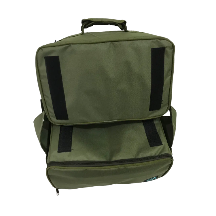 Сумка состоит из трех отдельных секций, каждая выполняет свою уникальную функцию. Первая секция предназначена для хранения мелких аксессуаров и инструментов. Вторая секция имеет мобильные перегородки, которые можно менять местами для удобного размещения 4-х катушек и запасных шпуль. Третья секция, предназначенная для коробок и аксессуаров, отсоединяется и может использоваться в качестве отдельной сумки. Дополнительные боковые карманы с сеткой обеспечивают легкий доступ к часто используемым вещам.