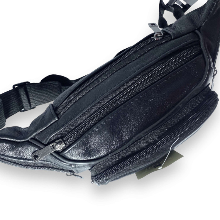 Бананка Gorangd, кожаная, одно отделение, четыре фронтальных кармана на замке, размер: 30*15*8 см, черная.