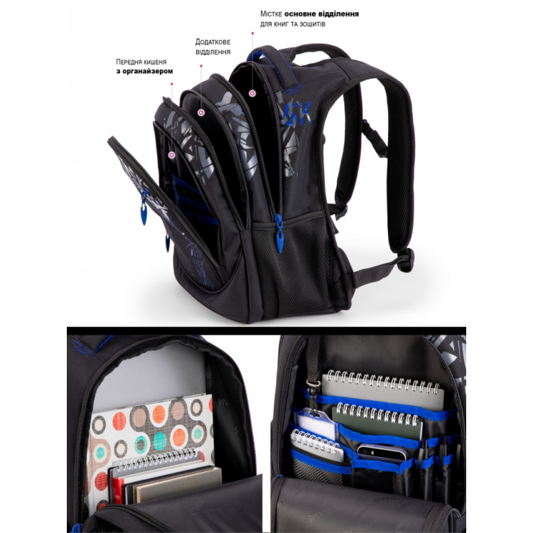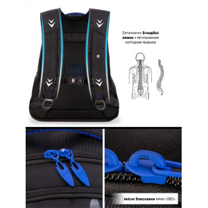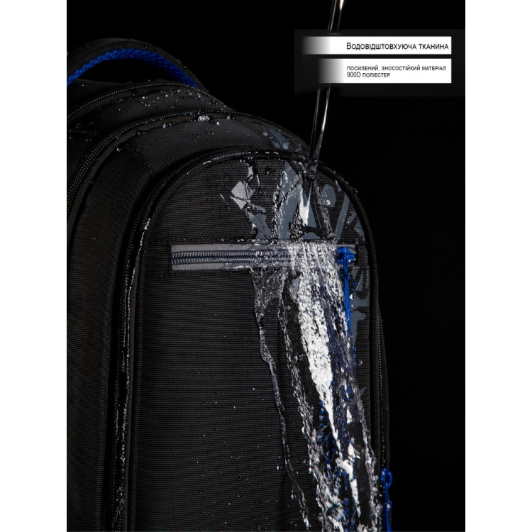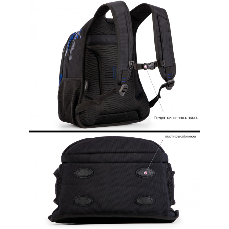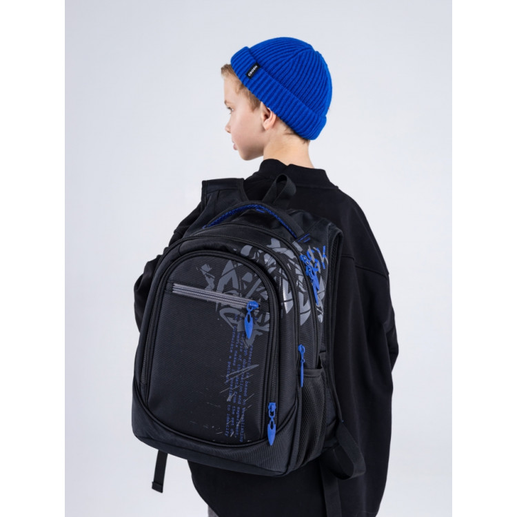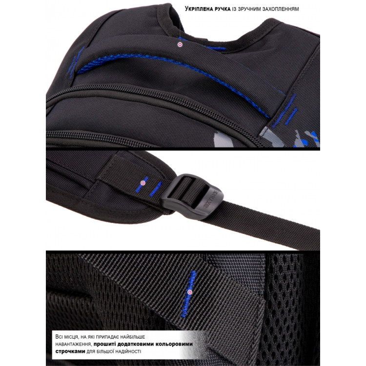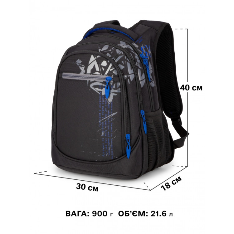 Міцний і місткий — чудовий вибір для учнів середніх та старших класів. Сучасне поєднання чорного з синім додає рюкзаку характеру, а продумана конструкція гарантує комфорт у повсякденному використанні.