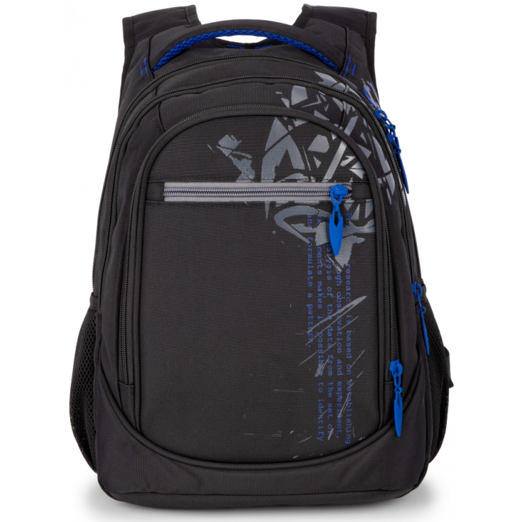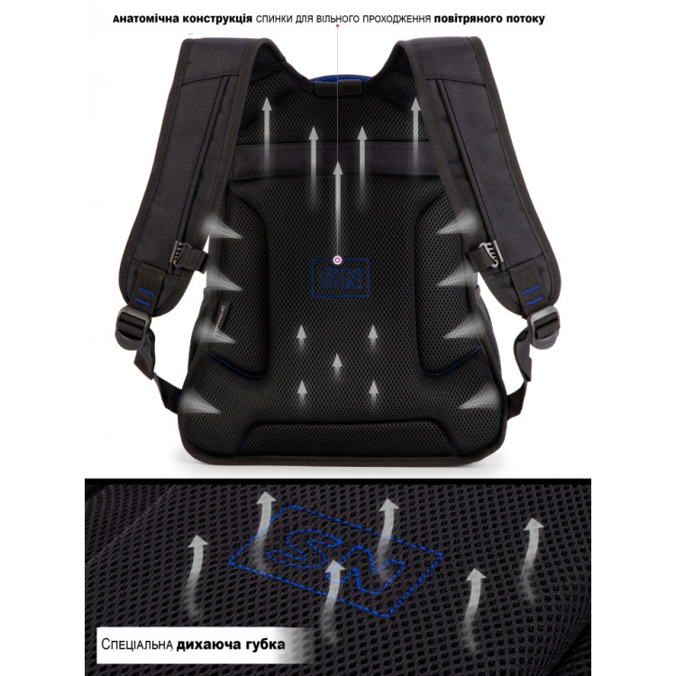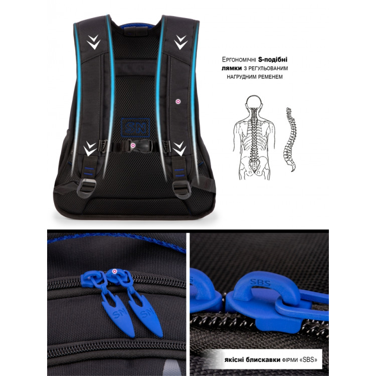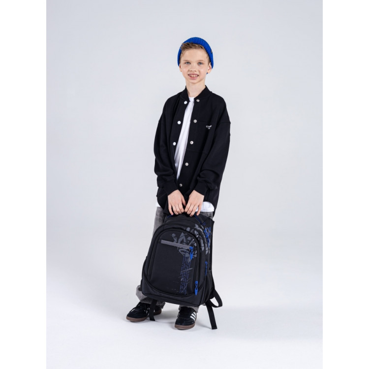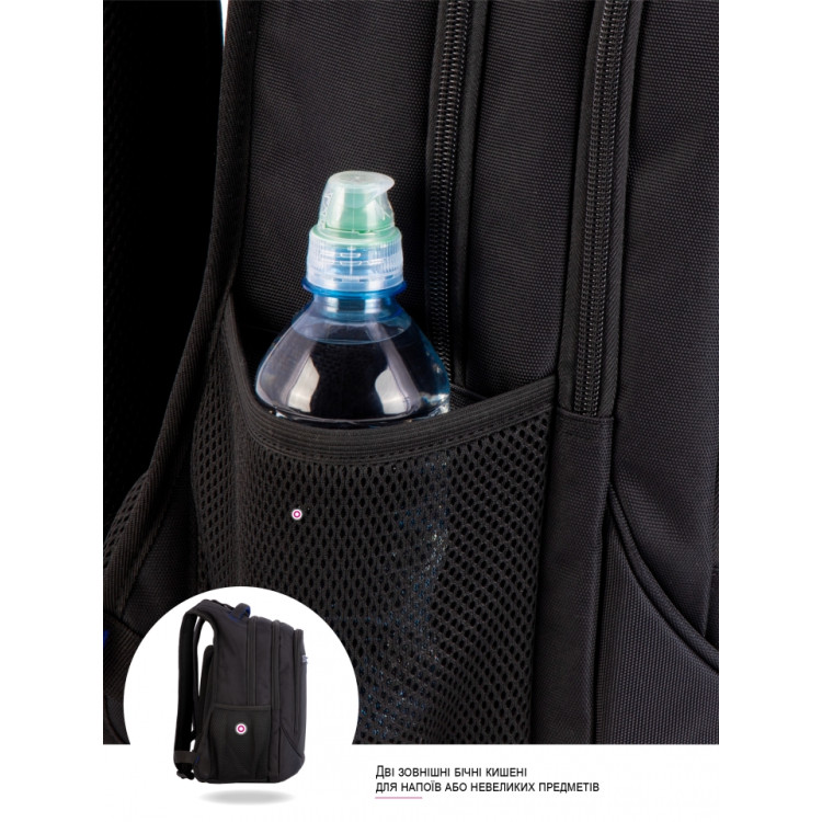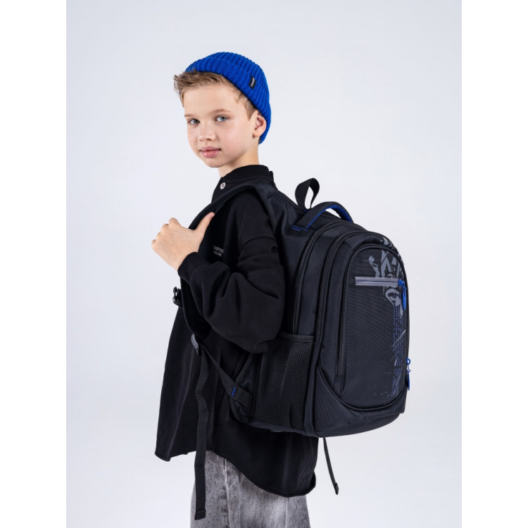 Міцний і місткий — чудовий вибір для учнів середніх та старших класів. Сучасне поєднання чорного з синім додає рюкзаку характеру, а продумана конструкція гарантує комфорт у повсякденному використанні.