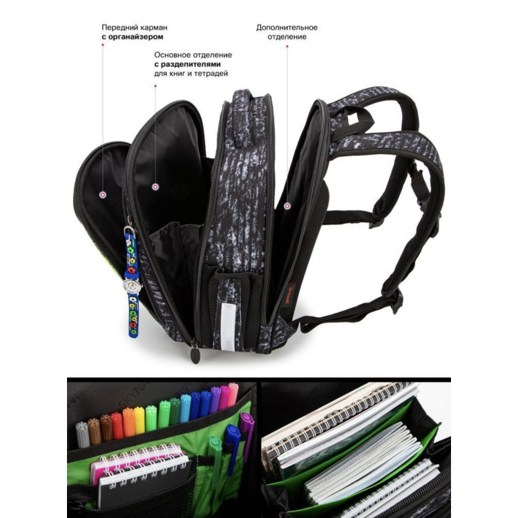 Основне велике відділення у спини, з тканинними роздільниками, для шкільного приладдя.