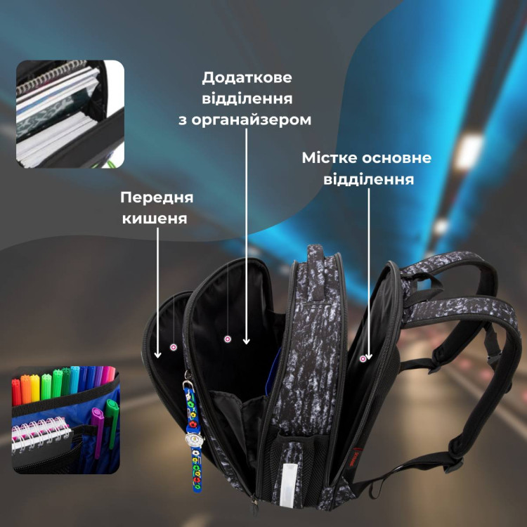 У передньому відділенні місце для зошитів та органайзер для письмового приладдя.