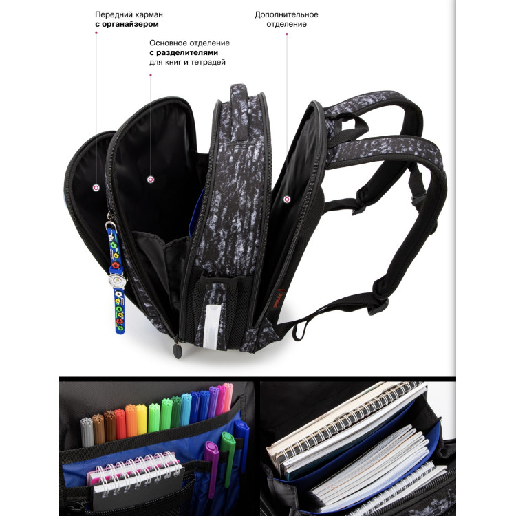 Основне велике відділення у спини, з тканинними роздільниками, для шкільного приладдя.
