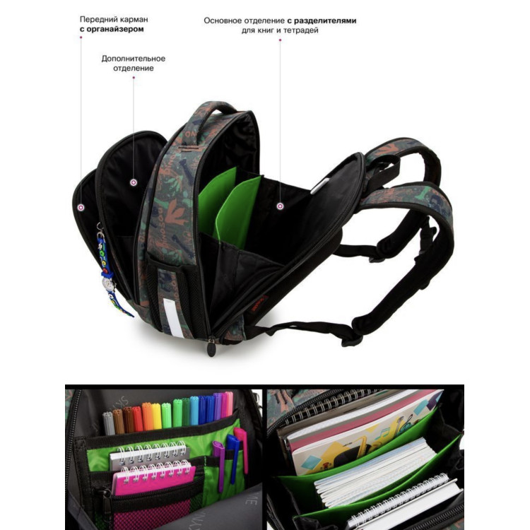 Основне велике відділення у спини, з тканинними роздільниками, для шкільного приладдя.
