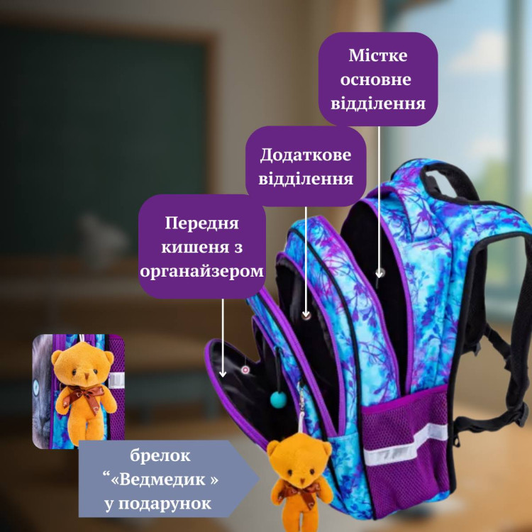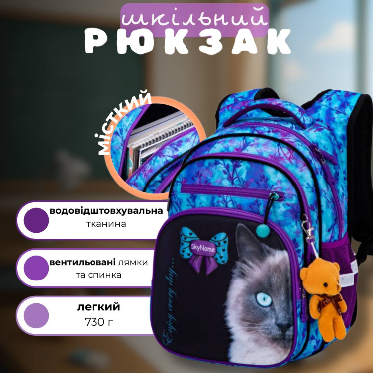 Ранець, рюкзак для дівчинки R3-246, з додатковою кишенею, три відділи, ортопедична спинка, захист від вологи, брелок-ведмедик Winner One/SkyName 30*18*38 см, різнокольоровий