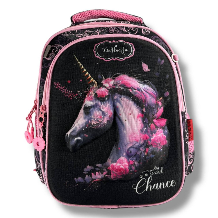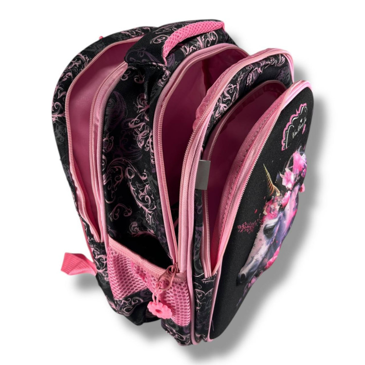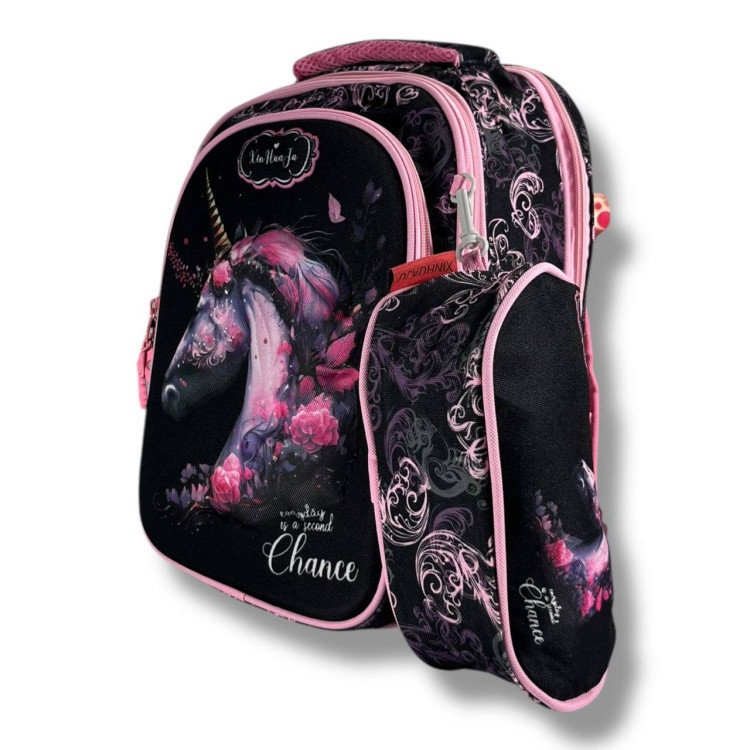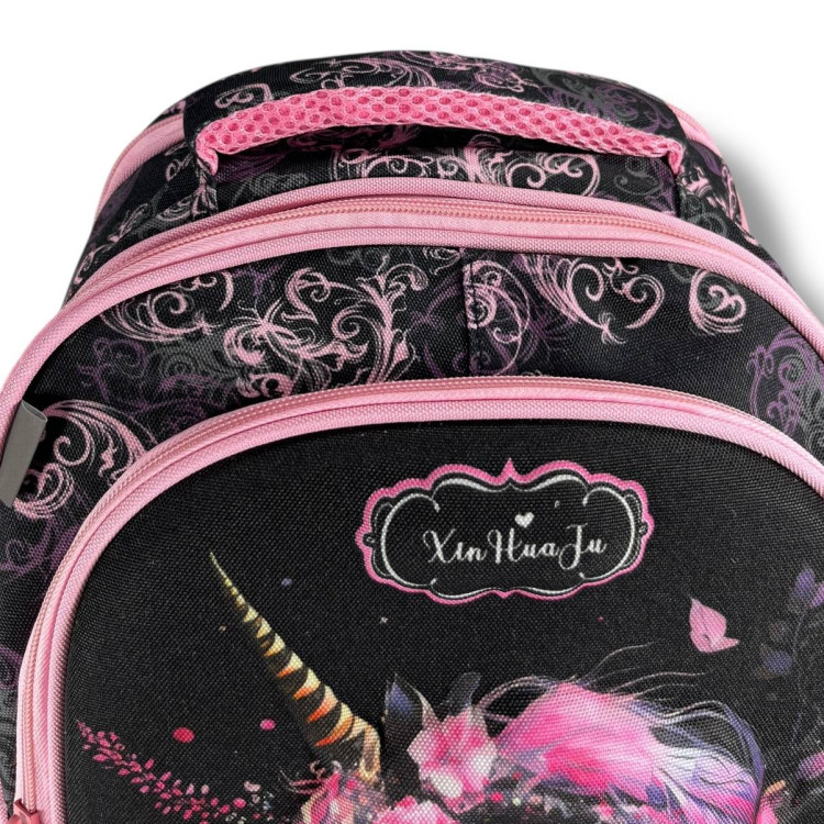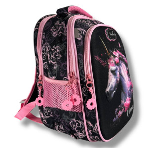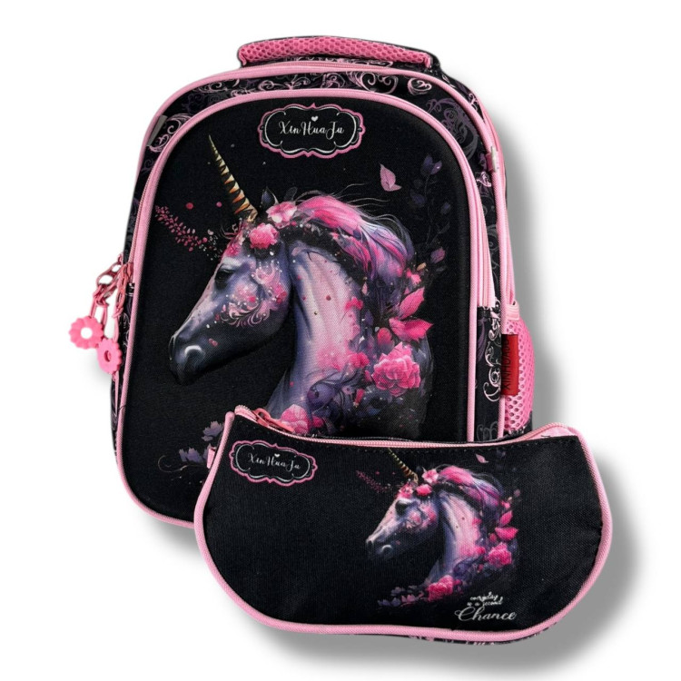 Чорний рюкзак прикрашений ніжним принтом з єдинорогом — улюбленим героєм багатьох дівчаток. У комплекті — пенал з тим самим малюнком.