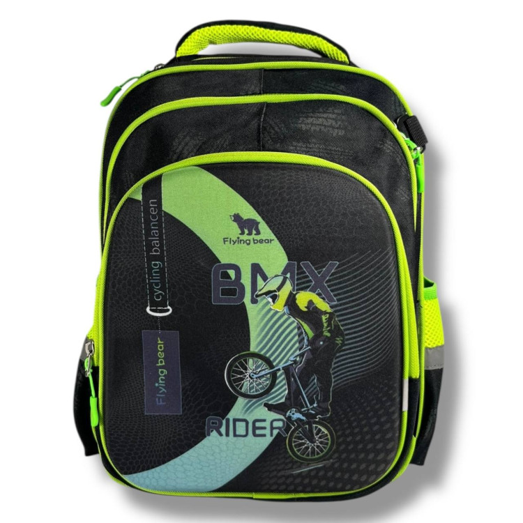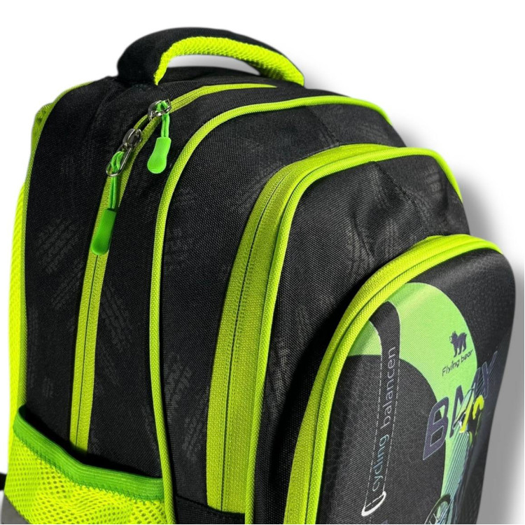 Чорний рюкзак із яскравим принтом велосипедиста — ідеальний аксесуар для енергійного школяра, який обожнює рух і спорт.