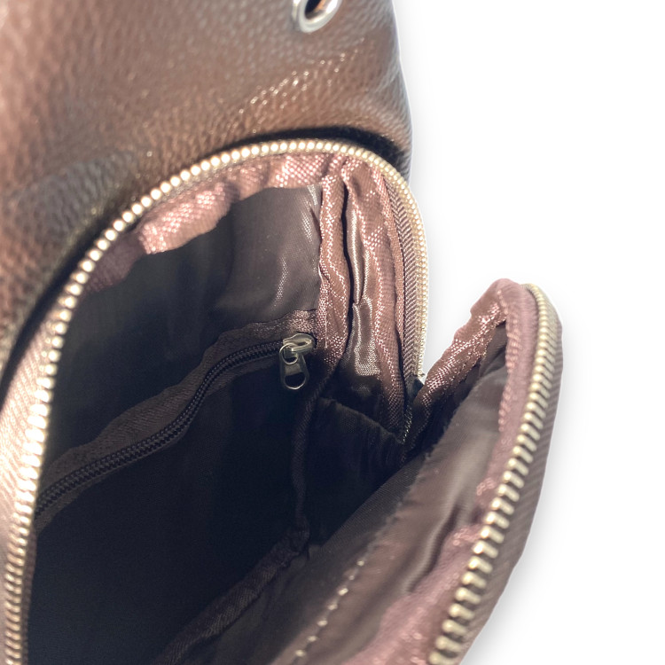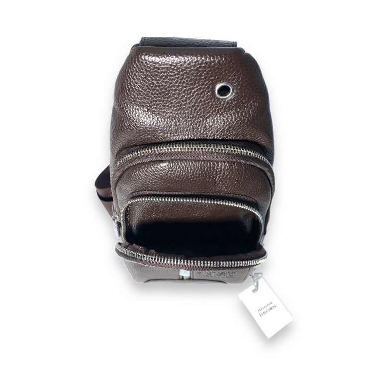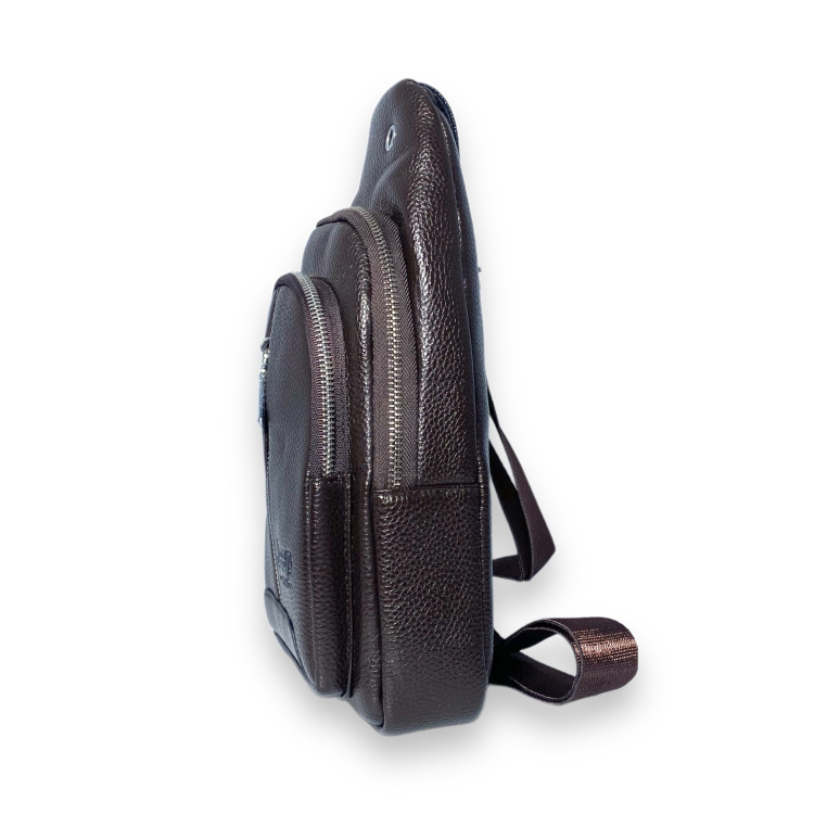 Сумка через плече, слінг, один із самих зручних та популярних передметів повсякденного вжитку для чоловіків. Таку сумку можна носити через плече, на грудях, або на спині. З ціллю забезпечити вміст сумки від злодіїв, часто її носять під верхнім одягом. Модель виготовлена із шкірзамінника, має два відділи, внутрішню кишеню, кишеню на лицевій стороні. Передбачений отвір для навушників. Ремінь тканинний міцний, регульований.