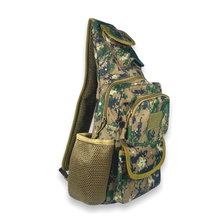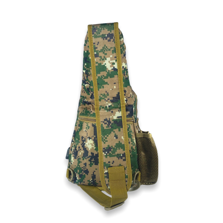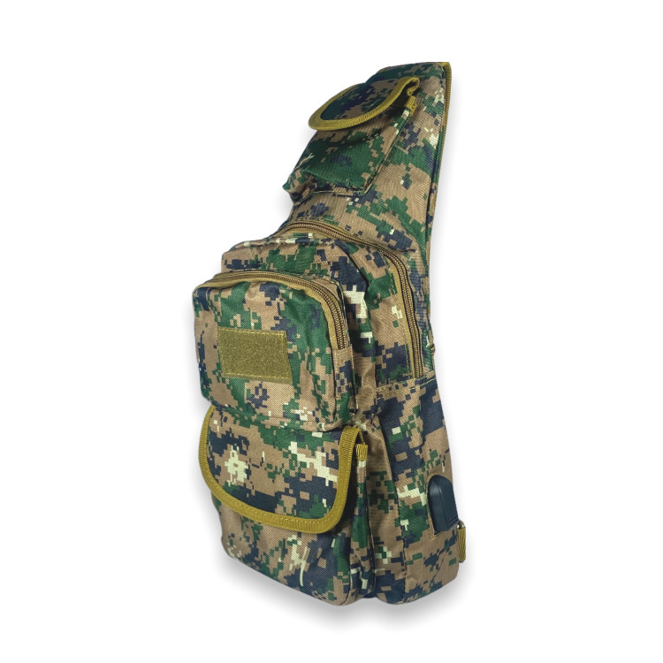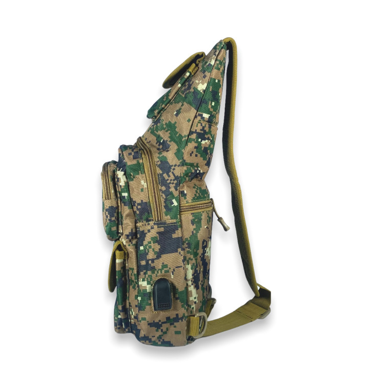Сумка слінг, незамінний аксесуар, органайзер для своїх особистих речей. Відмінна річ для військових і для людей, котрим приходиться мати при собі різні мілкі предмети. Виготовлена з міцної тканини з якісною фурнітурою та вологостійкими властивостями. Має одне відділення, дві фронтальні кишені, одна з яких на блискавці, інша відкрита під клапаном на липучці. Передбачена бокова кишеня та кишеня на звороті сумки. Є маленька кишеня під клапаном у верхній частині сумки. Важливим та зручним доповненням цієї сумки є встановлений на боковій частині USB-слот з кабелем.